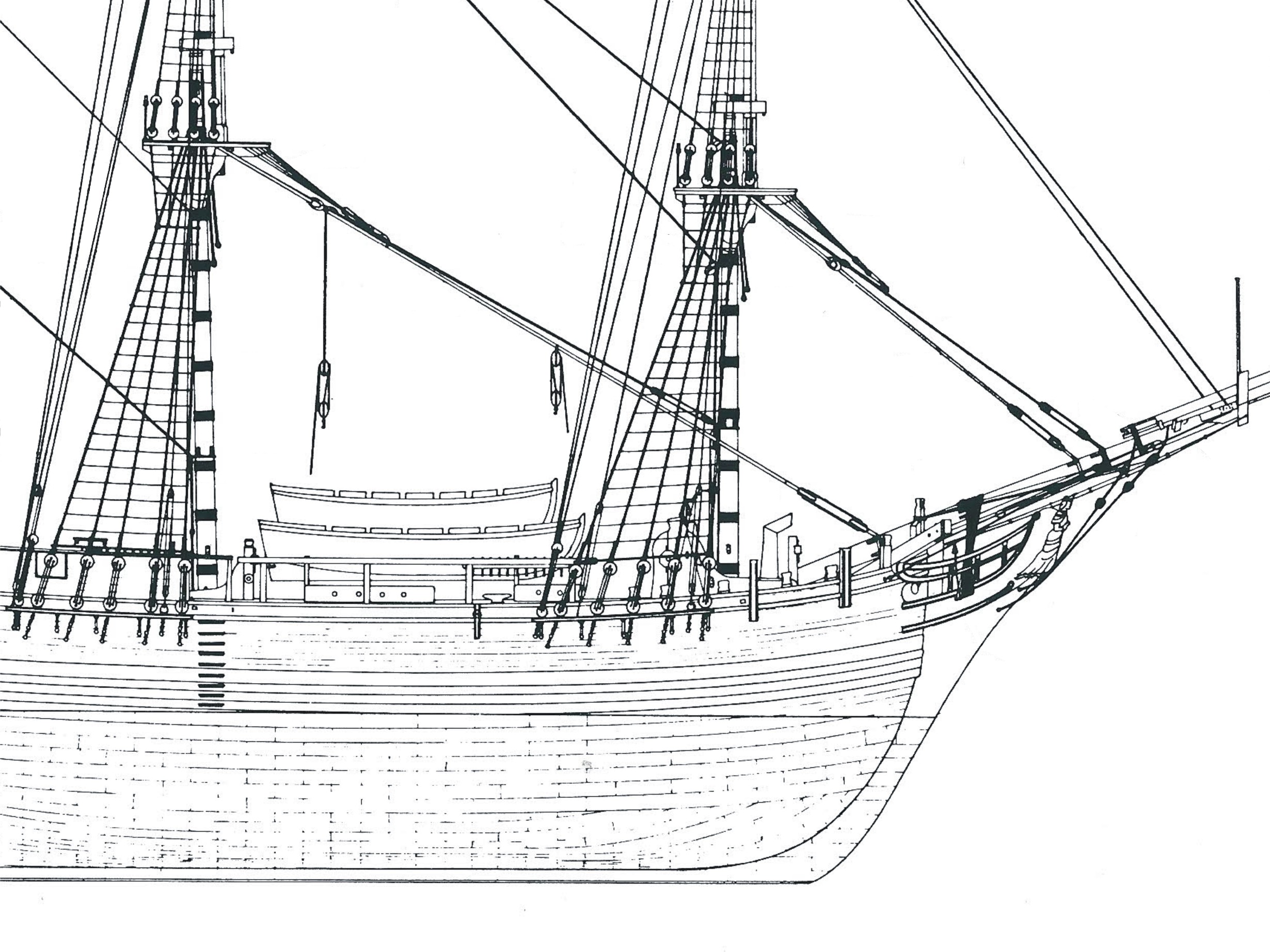 Фотография австралийской реплики 1979 года, на которой хорошо видны многочисленные утки для крепления концов бегучего такелажа на баке. Маккей явно что-то здесь упустил.