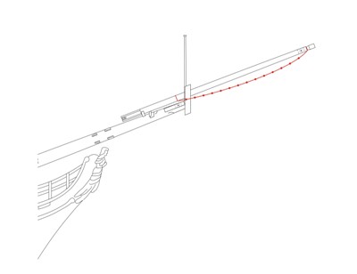 Нижний одношкивный блок блинда-фала принайтован к блинда рею посередине. К обуху. находящемуся в задней нижней части бушпритного эзельгофта, принайтован лонг-такель-блок. Коренной конец тали крепится к одношкивному блоку, далее трос проходит через нижний шкив лонг-такель-блока, возвращается назад к одношкивному блоку, где проходит через его шкив и снова идет к лонг-такель-блоку. где проходит через верхний, больший, шкив. Лопарь крепят на утке, на баке, используется утка соседняя с той, на которую крепят фал утлегаря (см. 3 часть). Толщина фала блинда-рея составляет 0,18 толщины грота-штага, то есть ее можно принять равной 0,3 мм