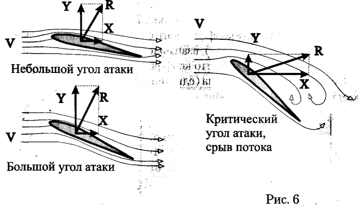 В точке В происходит отрыв пограничного слоя от поверхности крыла. За точкой отрыва возникает вихревое обтекание с линиями обратного тока. Происходит срыв потока. При дальнейшем небольшом увеличении угла атаки Су вначале слегка возрастает. Но точка отрыва быстро перемещается вперед по верхней образующей, после чего Су начинает падать. Угол атаки, на котором достигается перегиб кривой Су, называется критическим углом атаки.
